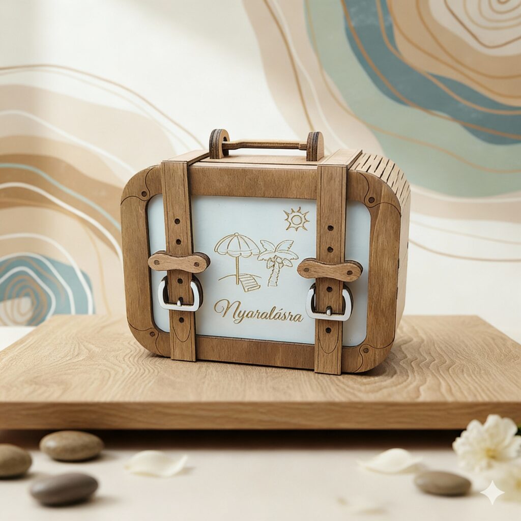 Különleges bőrönd kialakítású persely 3 mm vastag nyár rétegelt lemezből, vegyesen natúr és lazúrozott színben. Egyedi ajándékként vagy egyszerűen feldobni a gyűjtögetés hangulatát. Teljesen testreszabható, az általad igényelt felirattal / témával készül el (pl. nyaralásra, autóra, nászút, stb.). Kérheted fa előlappal, de akár átlátszó plexivel is, ha látni szeretnéd a tartalmát. Hátul, 1 kényelmesen elforgatható retesz eltávolításával férhetsz hozzá a megtakaraításodhoz.