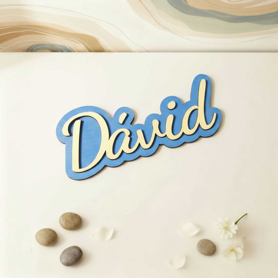 Kétrétegű fa névtábla vagy felirat rétegelt lemezből. A felirat és a hátlap igény szerint külön színezhető. Felhasználható bármilyen dekorációs célra, pl. gyerekszoba ajtajára, névtáblának vagy egyedi alkalmakkor (pl. esküvőn).