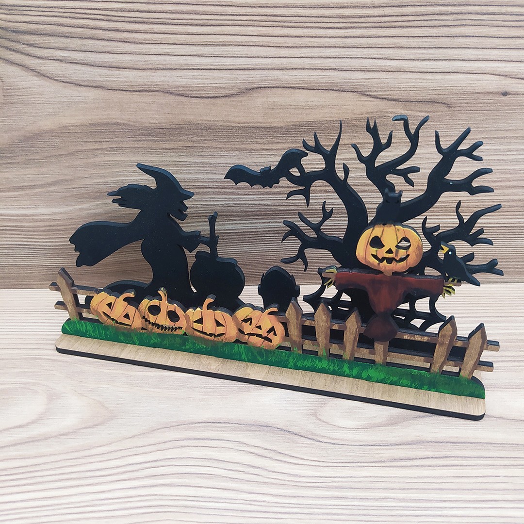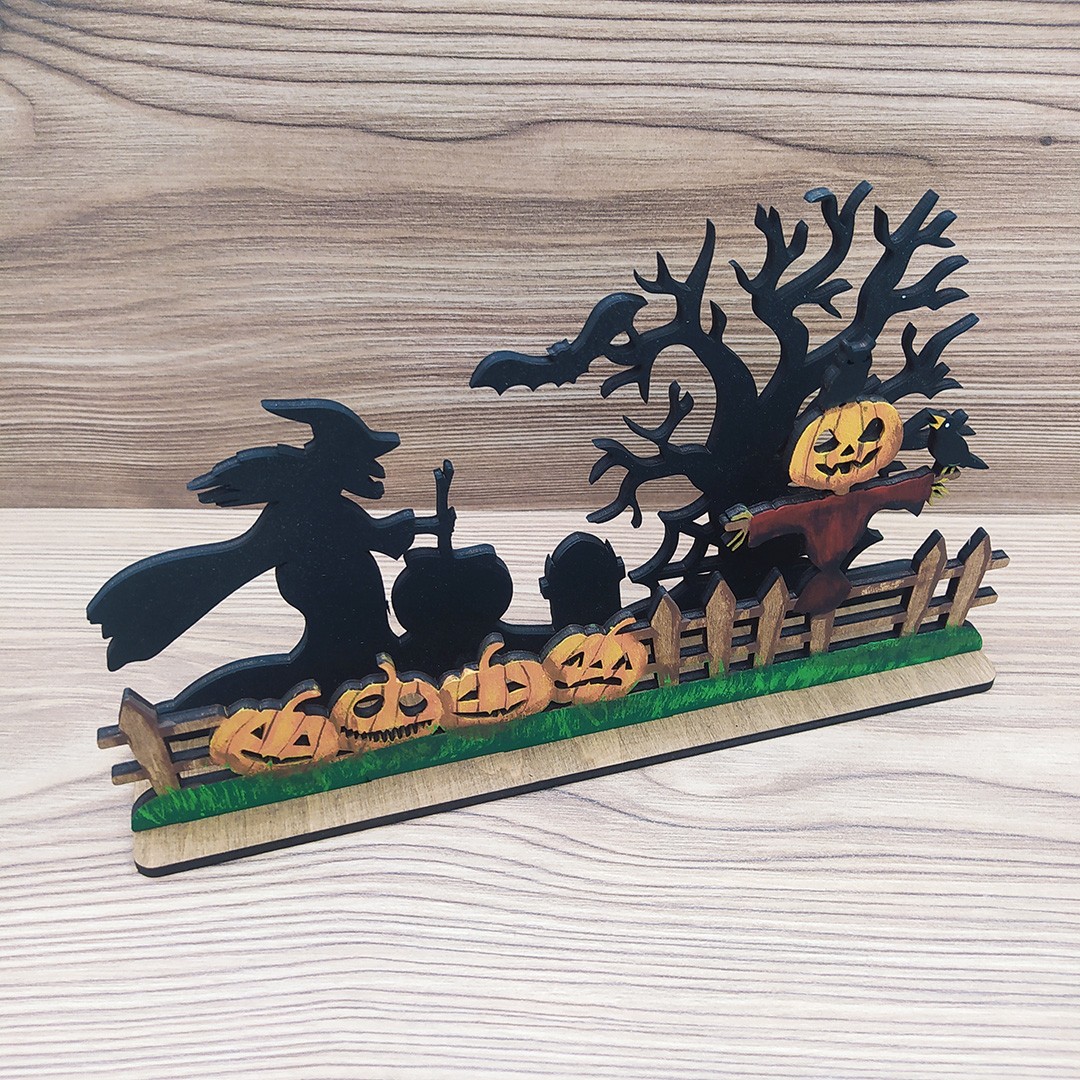 Halloween asztali dísz rétegelt lemezből, talpon, 2 különböző illusztrációval egymás mögött. A hangulat fokozására fénysorral is díszíthető. Mérete összeszerelve 20x12x4,6cm. Szalvétatartónak is használható.