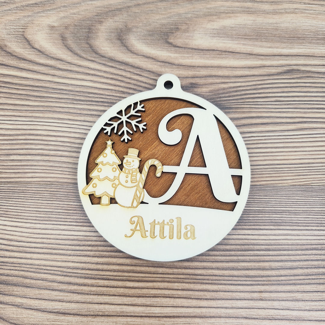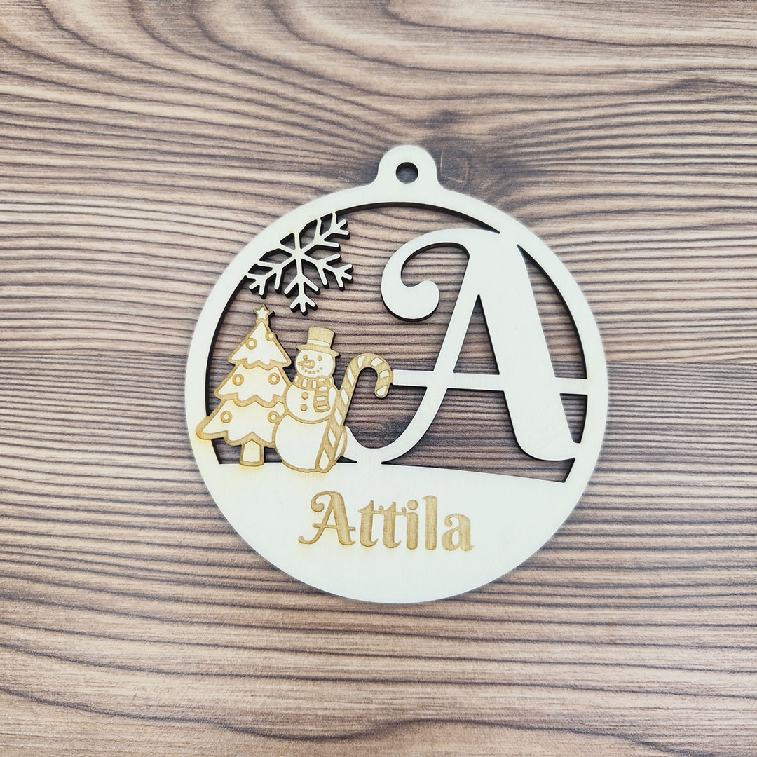 Lézervágott karácsonyfadísz 3mm vastag rétegelt lemezből. A termék az általad megadott névvel és az ahhoz tartozó kezdőbetűvel készül el.