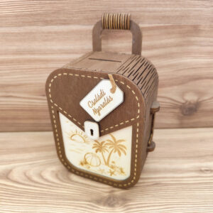 Utazó bőrönd persely, pénzátadó ajándék – 16x12x7,5cm Különleges utazó bőrönd kialakítású persely 3 mm vastag nyár rétegelt lemezből, vegyesen natúr és lazúrozott színben. Egyedi ajándékként vagy egyszerűen feldobni a gyűjtögetés hangulatát. Teljesen testreszabható, az általad igényelt felirattal / témával készül el (pl. nyaralásra, autóra, nászút, stb.). Hátul, 1 kényelmesen elforgatható retesz eltávolításával férhetsz hozzá a…