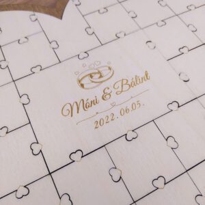 Esküvői szíves vendégkönyv – 36x30cm Esküvői szíves vendégkönyv, saját nevekkel gravírozva, melyet a pár eltehet a Nagy nap emlékére. A tervezés során szempont volt, hogy ne legyen bonyolult kirakni, a vendégeknek ne ez legyen az elsődleges elfoglaltsága, így a külső széleket leszámítva minden puzzle elem egyforma. Kérhető hagyományos és szív formájú puzzle csatlakozásokkal is, 42…