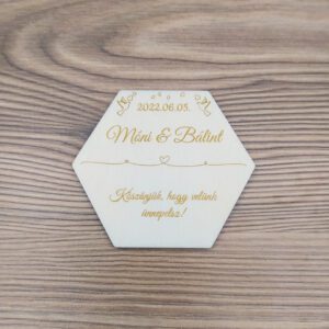 Esküvői ültetőkártya, poháralátét, köszönőajándék – hatszög – névre szóló – 8,5cm Egyedi köszönőajándék, poháralátét és ültetőkártya egyben. Emlék a barátoknak, családnak és az ifjú párnak. A termék minden esetben egyedileg készül az általad megadott nevekkel, szöveggel és dátummal. Mérete 8,5cm (bele írható kör ~7,4 cm), anyaga natúr nyárfa rétegelt lemez. Elkészítési idő normál esetben 2-3…